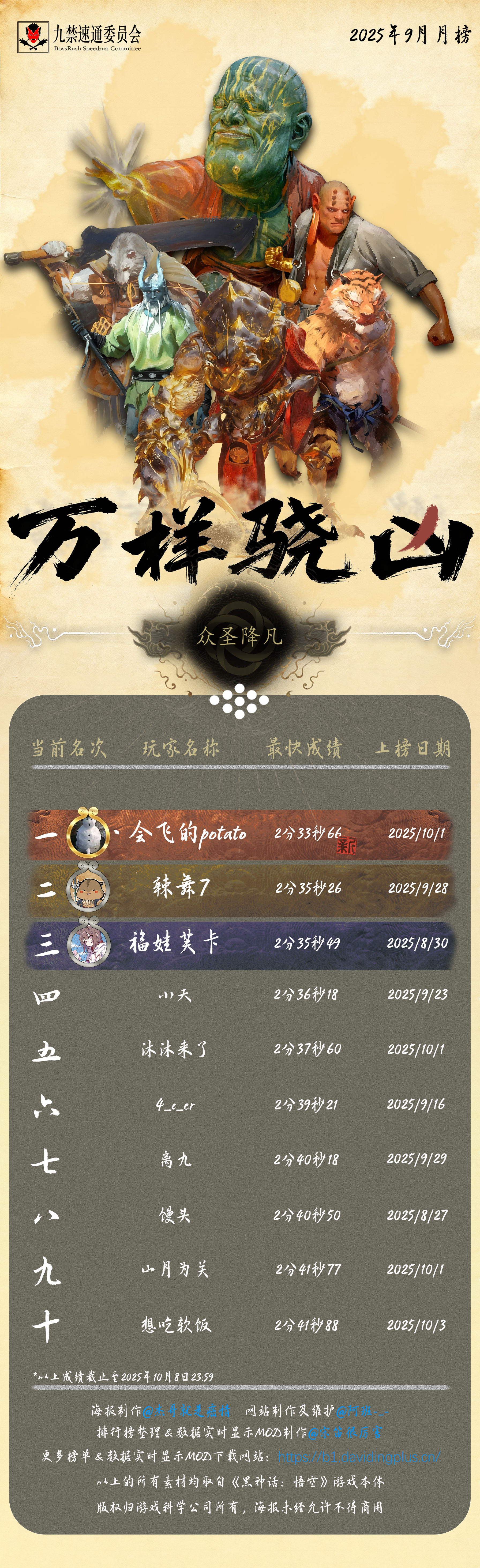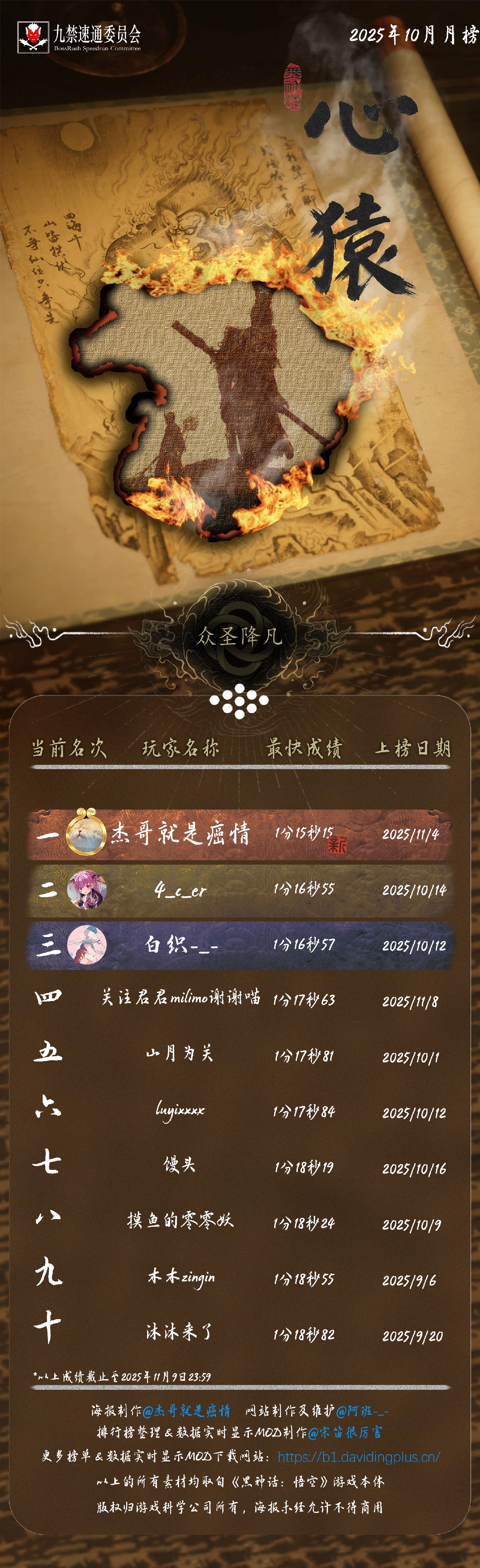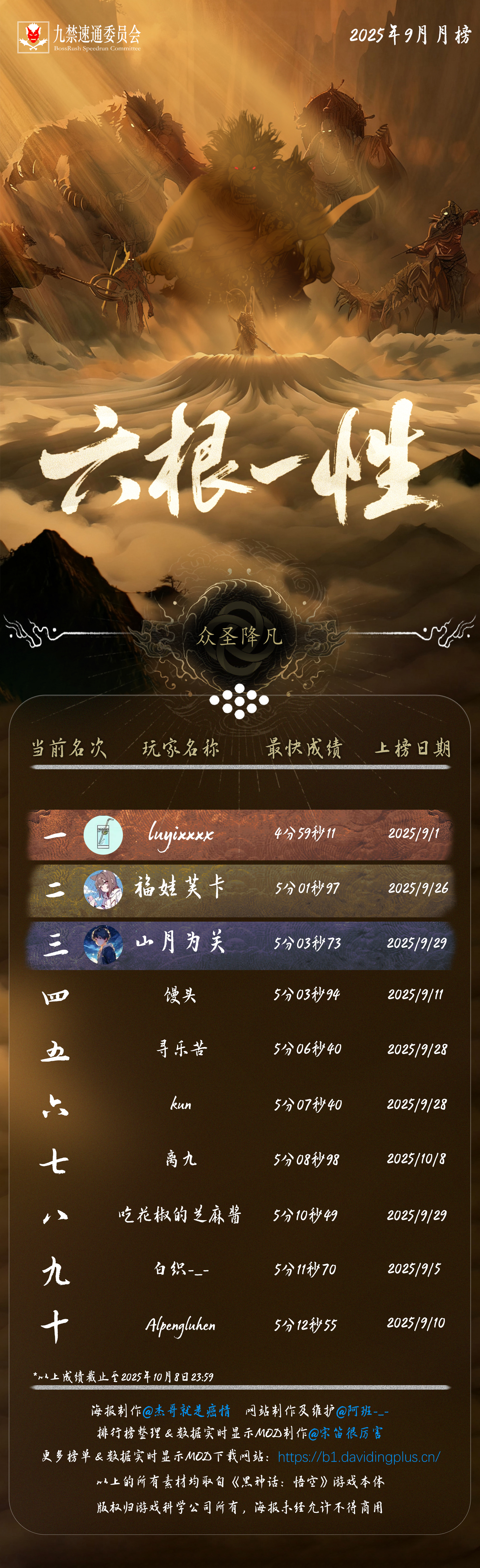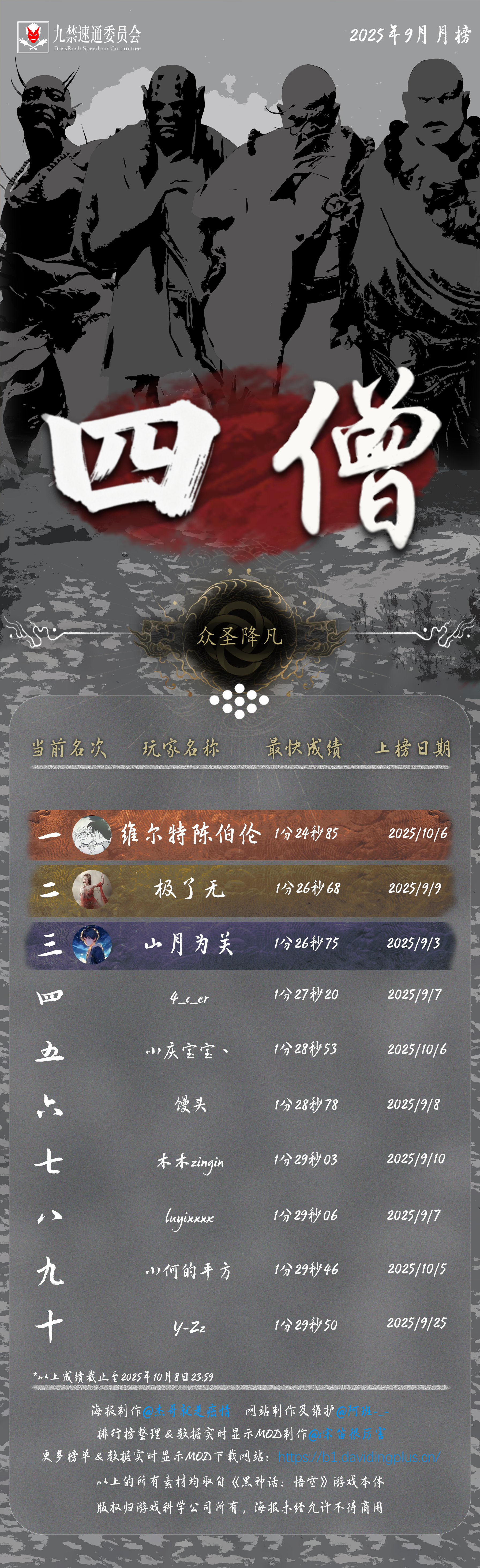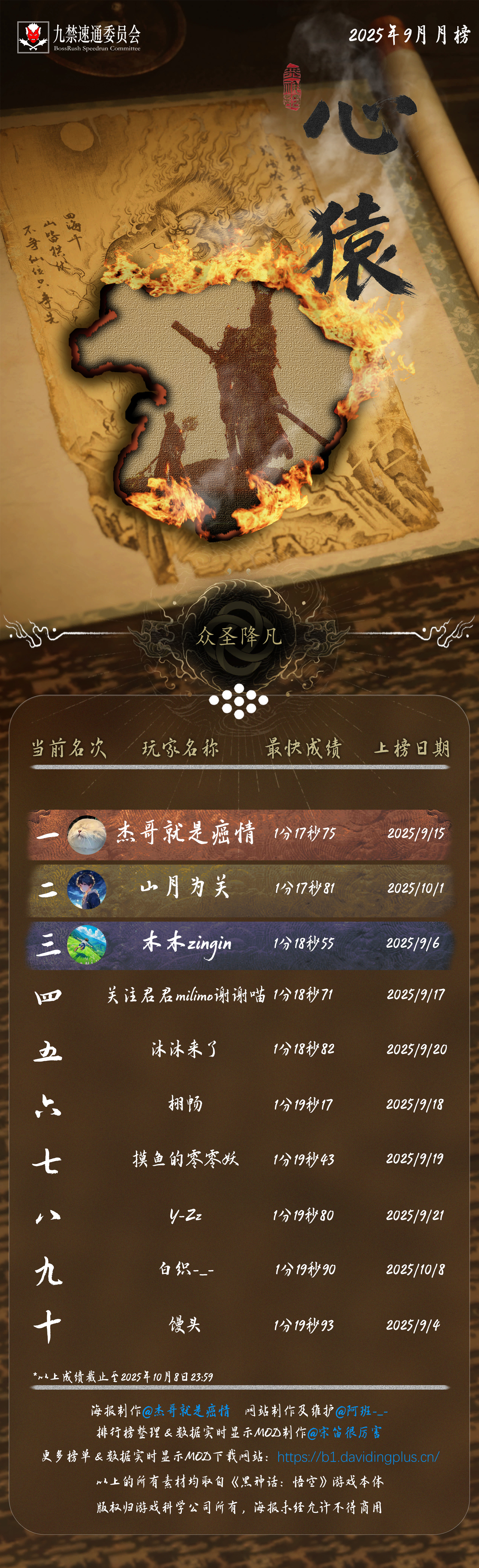 黑神话悟空九禁连战速通首个月榜(九月)发布!88 个席位,34 位天命人,15 次刷新纪录!每个成绩,都是一次次出棍、一帧帧闪避于千万次轮回的淬炼。感谢 @杰哥就是癌情 倾力制作的精美海报,感谢每一位速通天命人的努力和大家对实时数据显示 MOD 的支持!