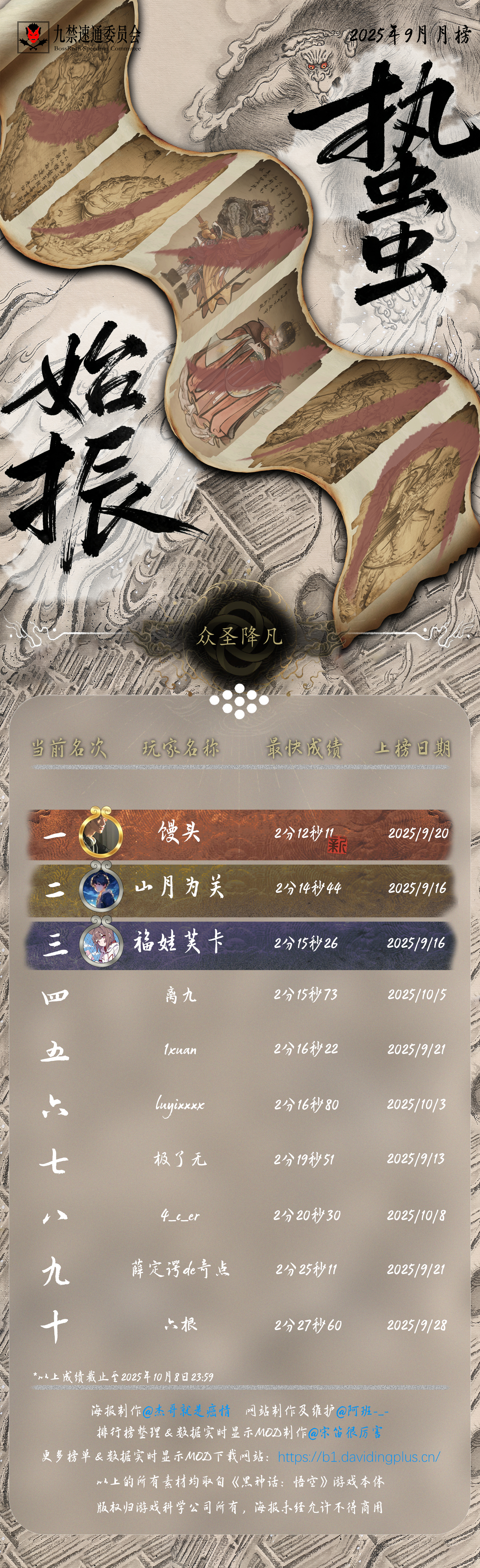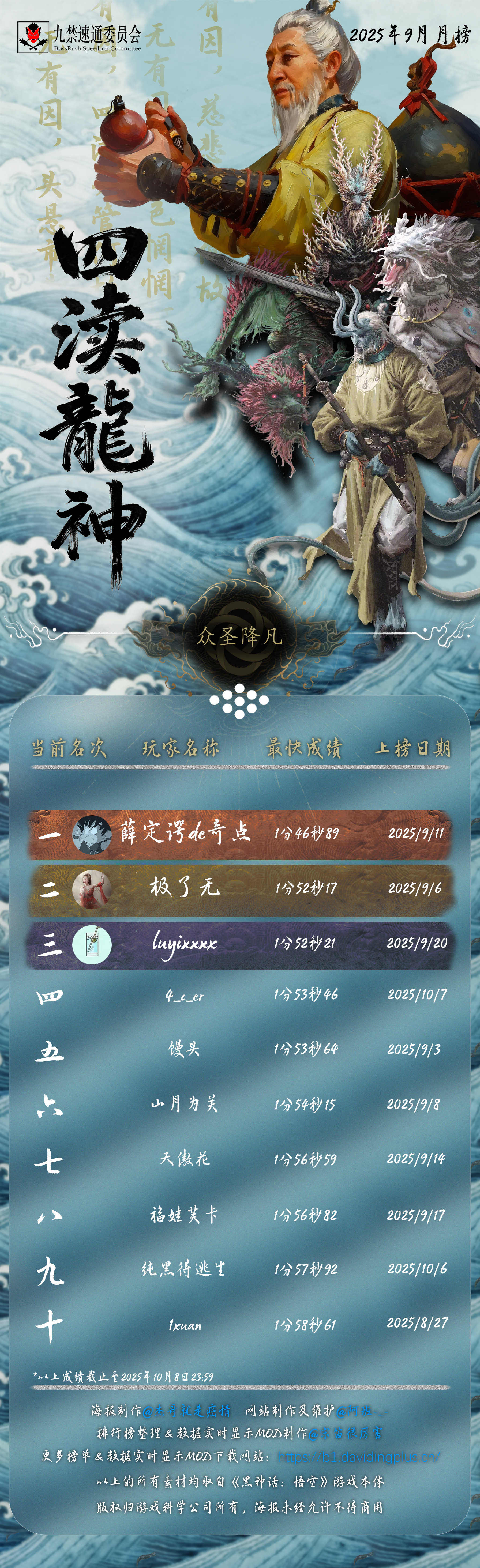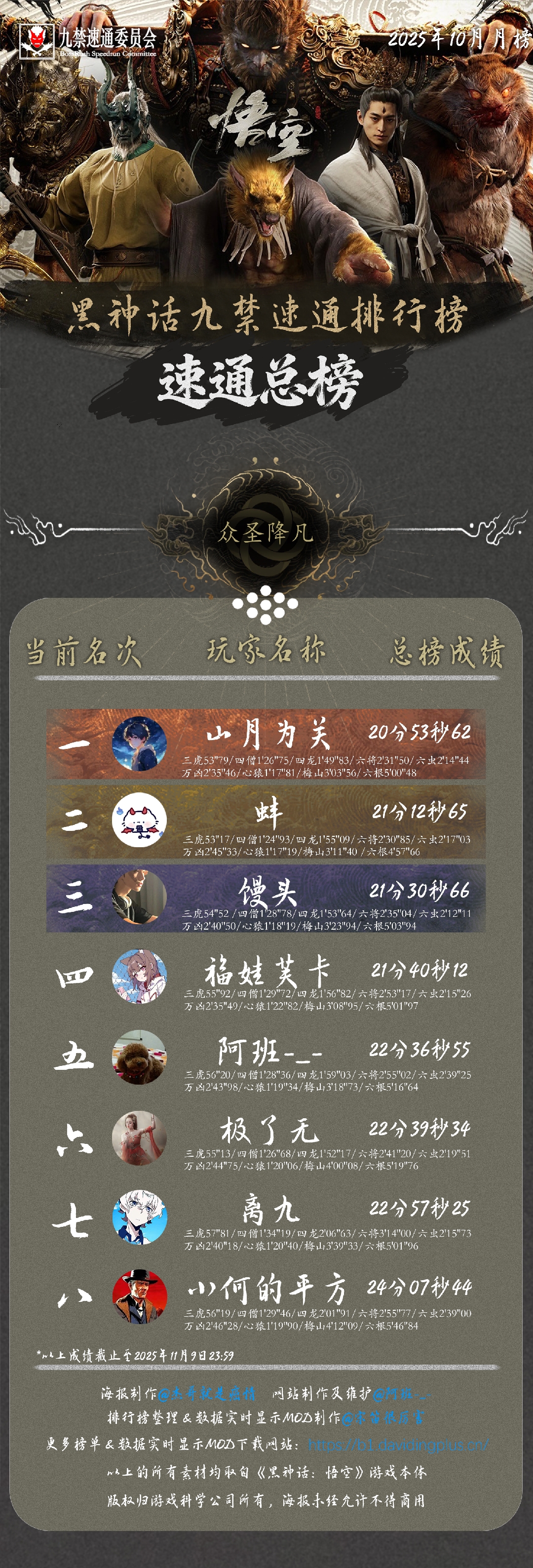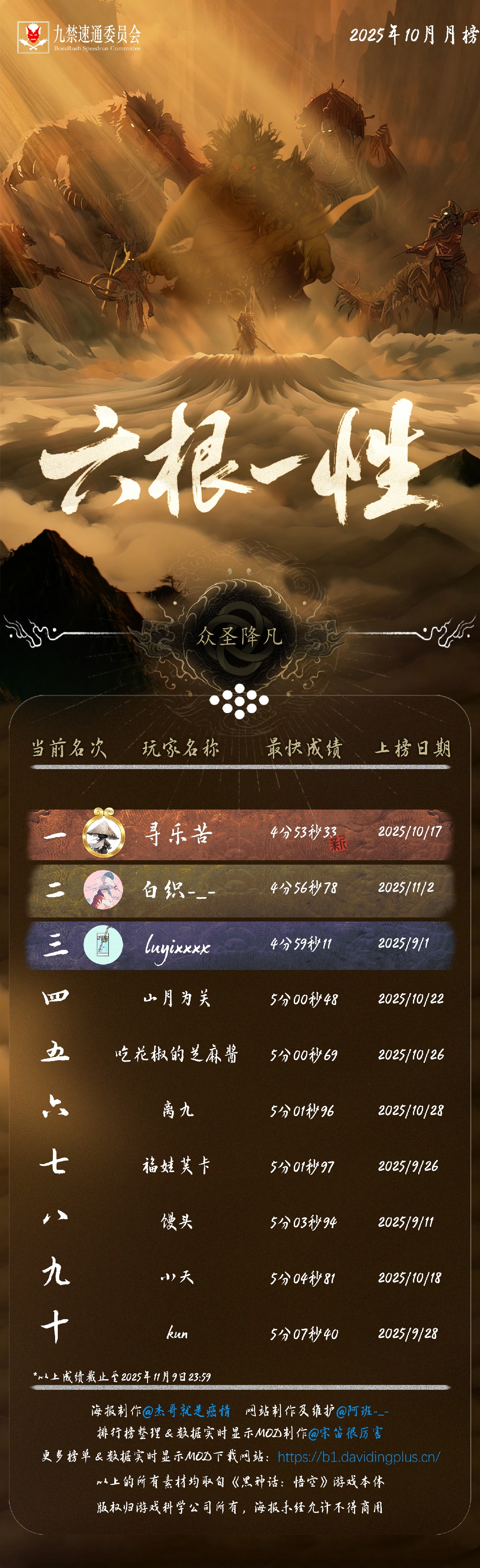 黑神话悟空九禁连战速通首个月榜(九月)发布!88 个席位,34 位天命人,15 次刷新纪录!每个成绩,都是一次次出棍、一帧帧闪避于千万次轮回的淬炼。感谢 @杰哥就是癌情 倾力制作的精美海报,感谢每一位速通天命人的努力和大家对实时数据显示 MOD 的支持!