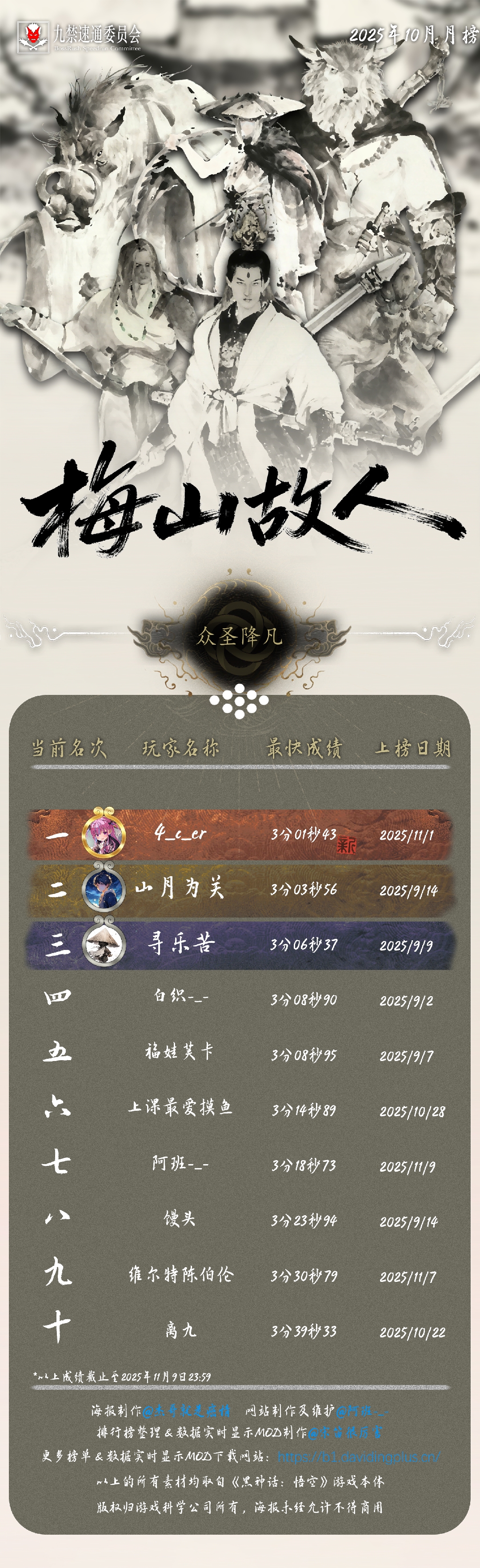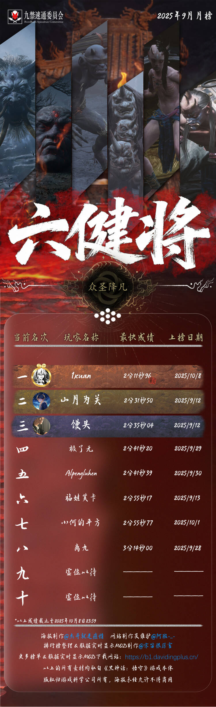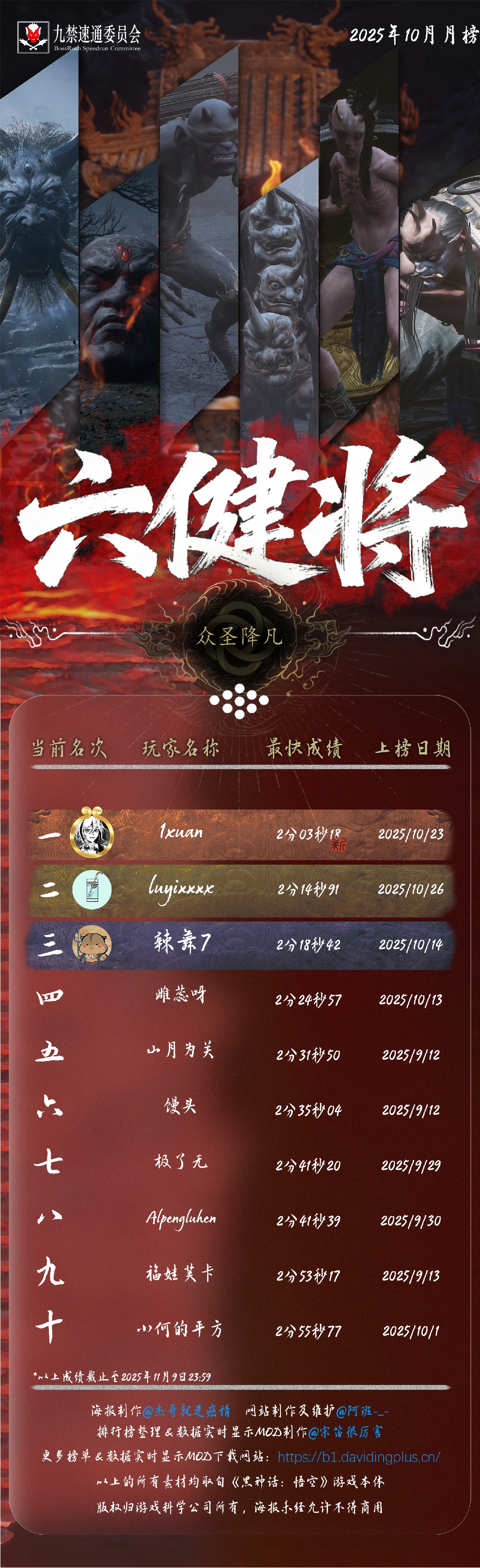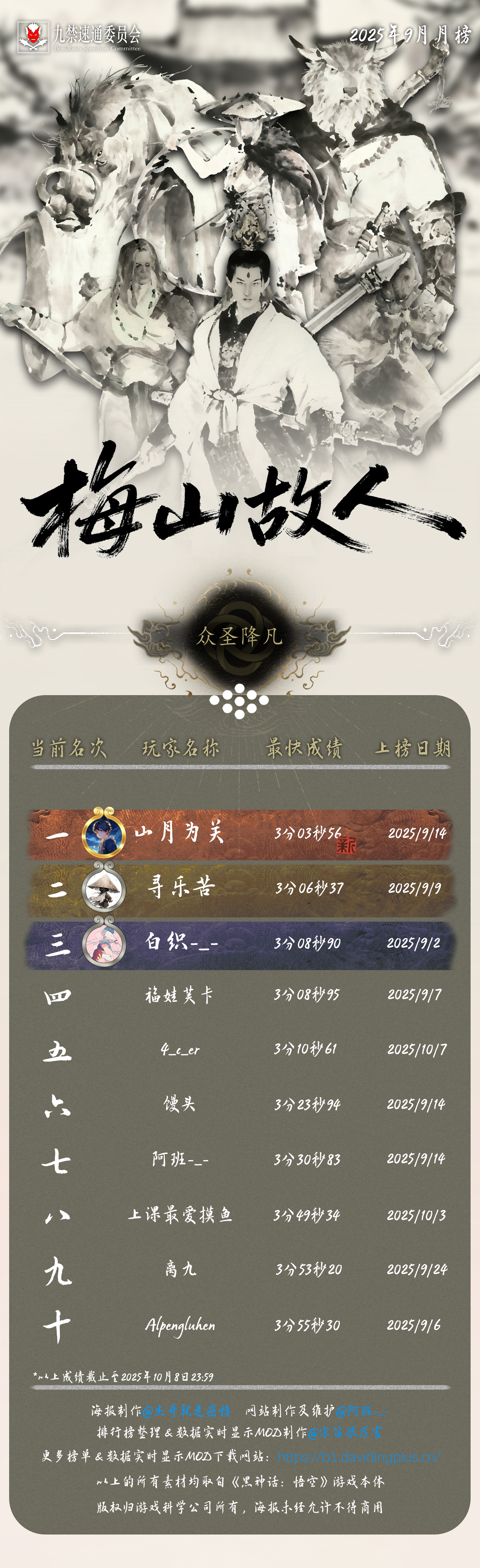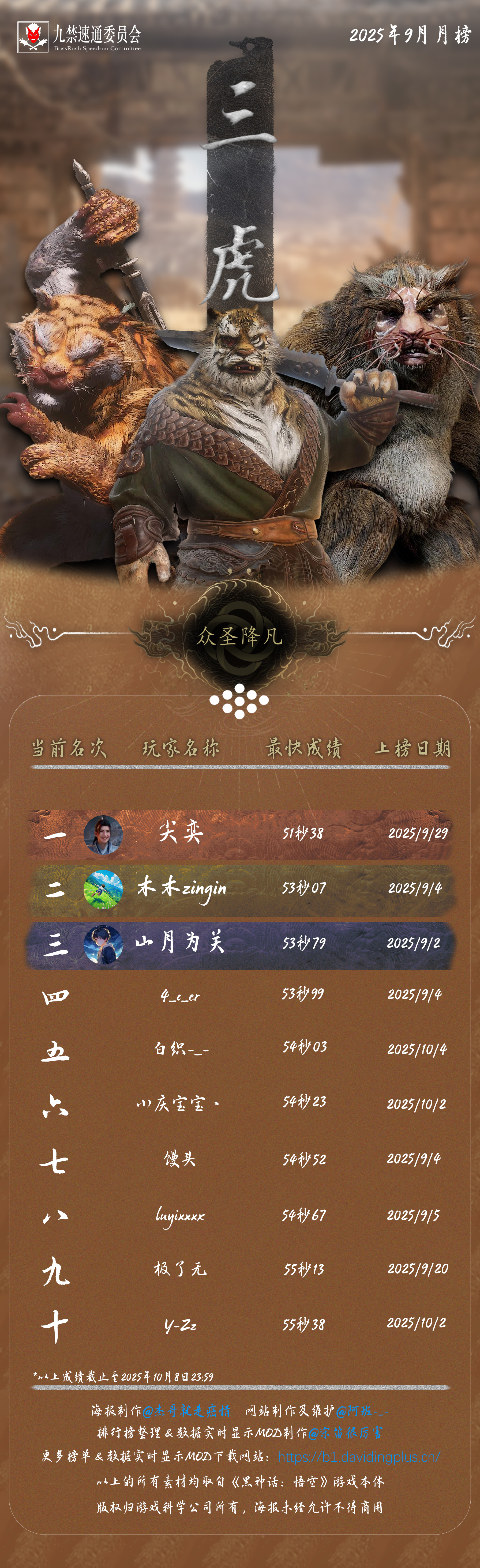黑神话悟空九禁连战速通首个月榜(九月)发布!88 个席位,34 位天命人,15 次刷新纪录!每个成绩,都是一次次出棍、一帧帧闪避于千万次轮回的淬炼。感谢 @杰哥就是癌情 倾力制作的精美海报,感谢每一位速通天命人的努力和大家对实时数据显示 MOD 的支持!