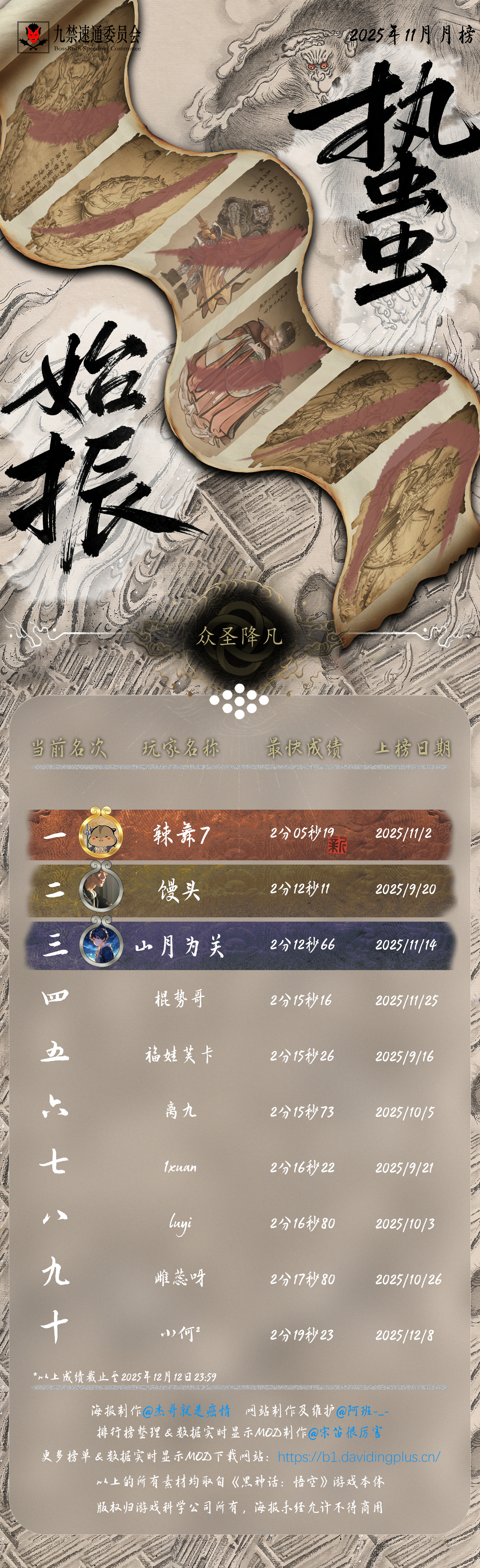 原动态地址:黑神话悟空九禁连战速通十一月月榜。