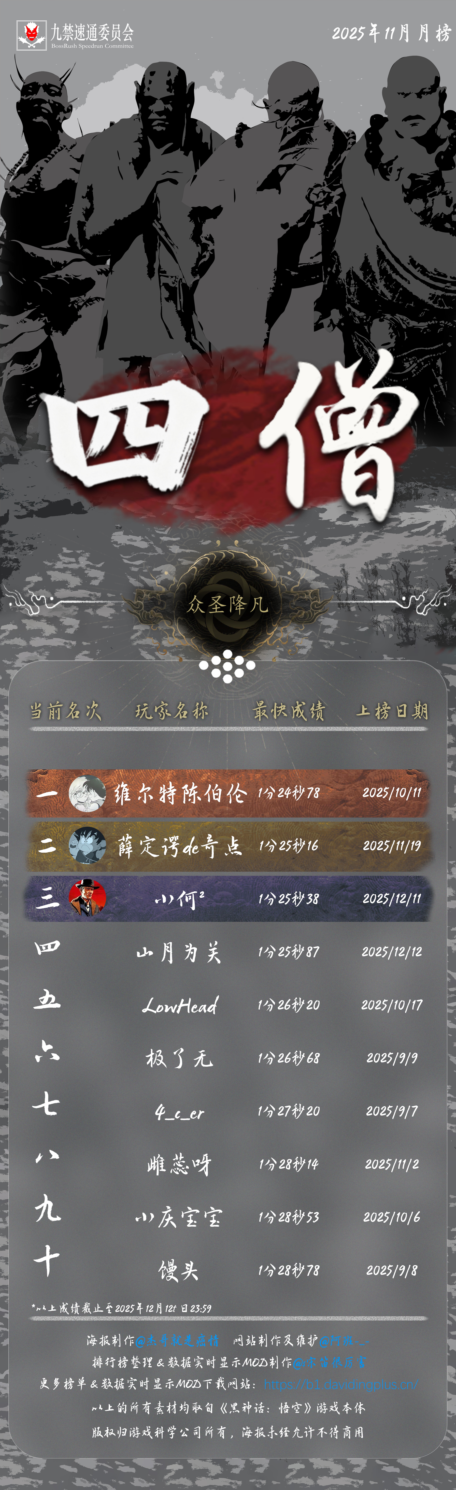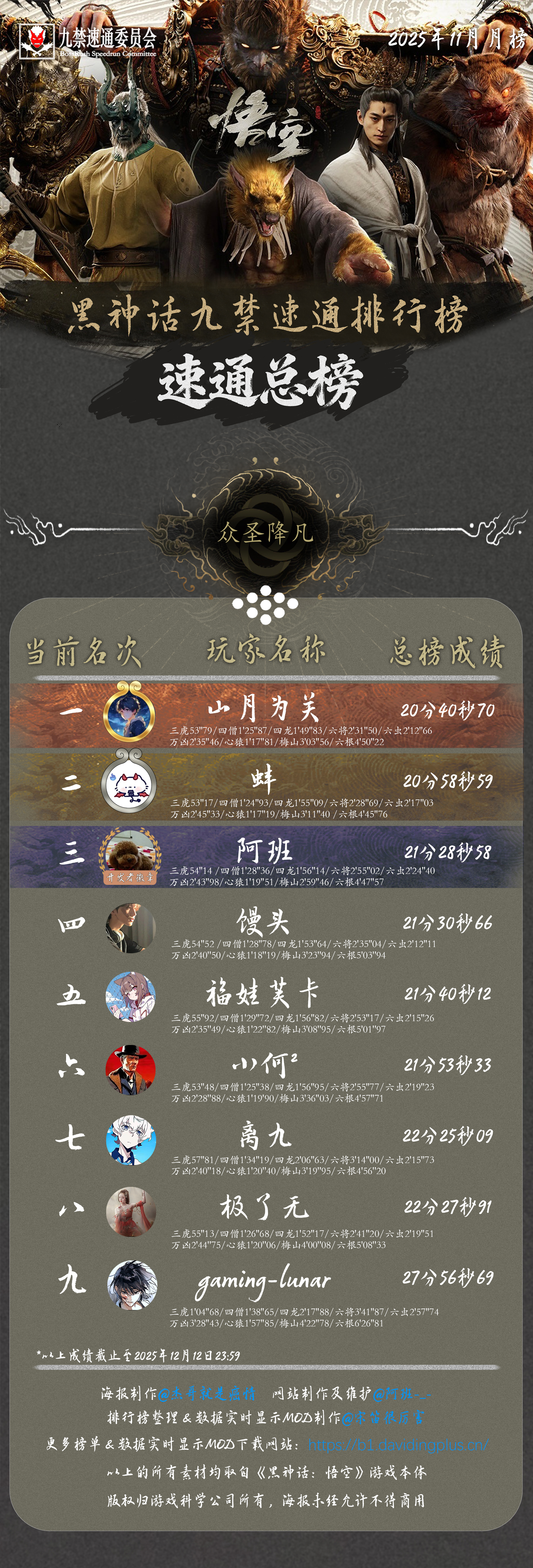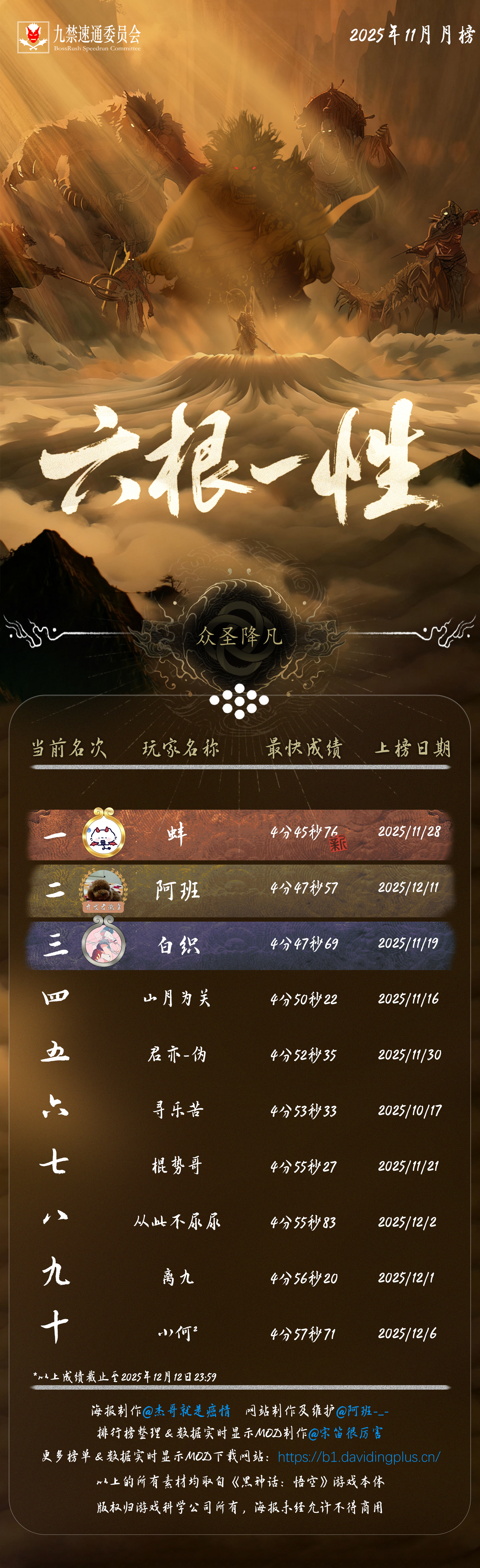 感谢 @杰哥就是癌情 倾力制作的精美海报,也感谢每一位速通天命人的努力和大家对实时数据显示 MOD 的支持!下一次月榜连战一周年纪念见!(12 月 10 日)