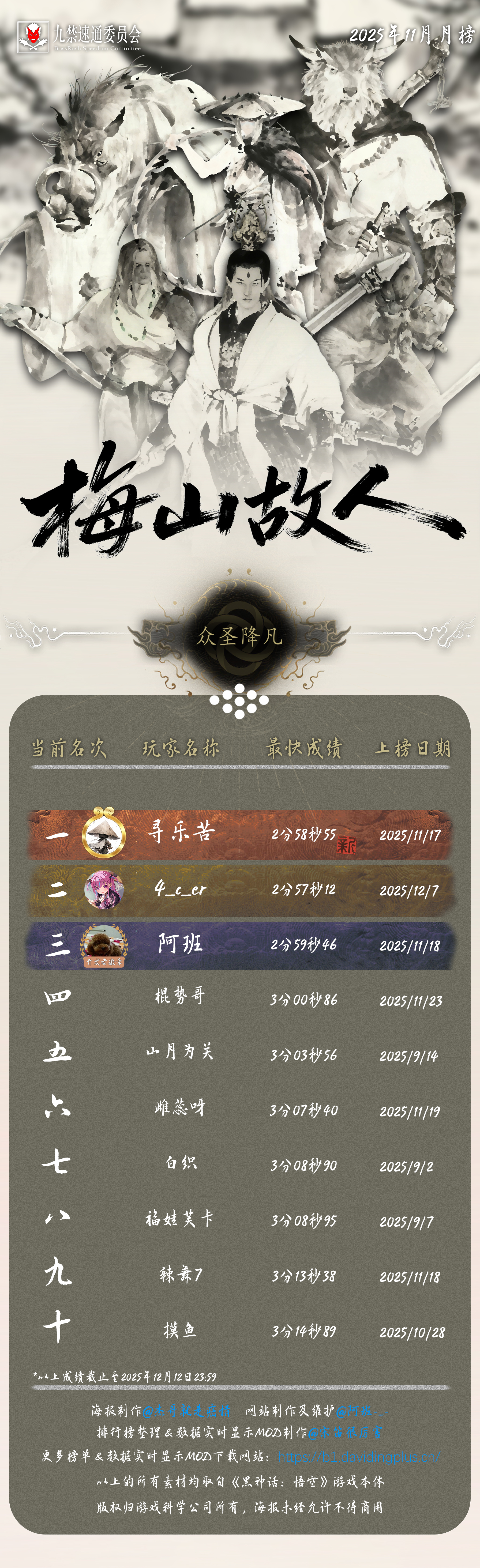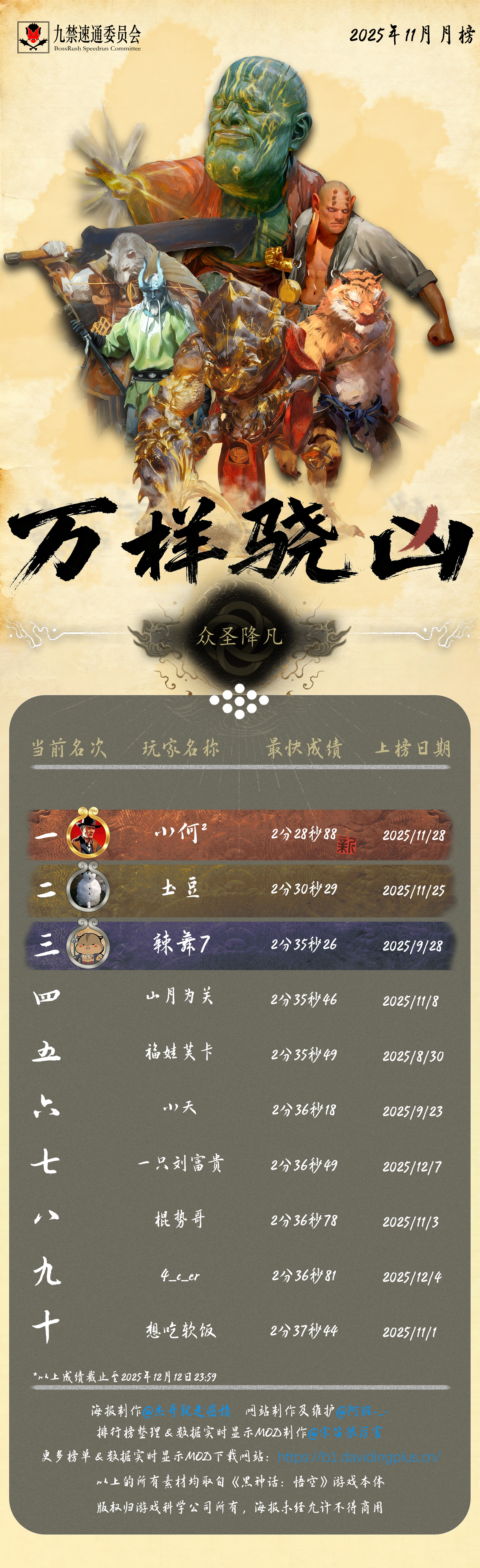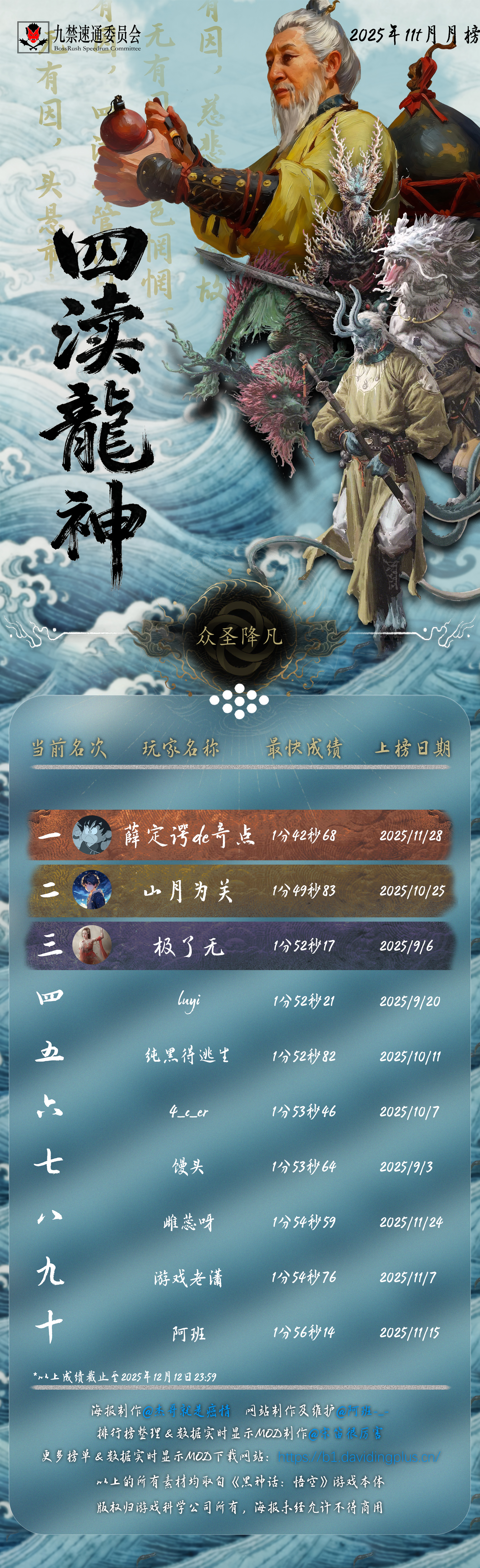 感谢 @杰哥就是癌情 倾力制作的精美海报,也感谢每一位速通天命人的努力和大家对实时数据显示 MOD 的支持!下一次月榜连战一周年纪念见!(12 月 10 日)